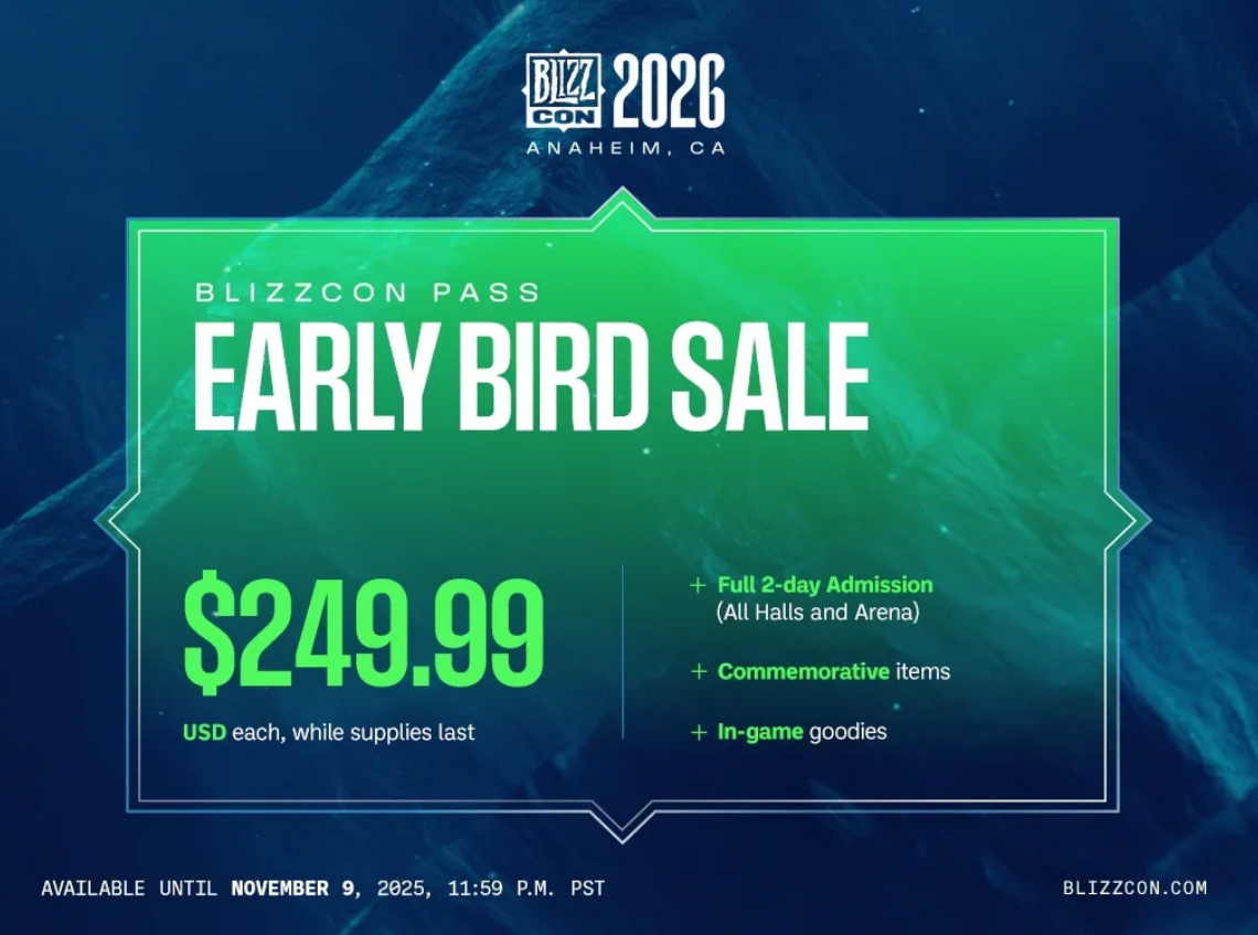暴雪中国表示,守望、炉石、魔兽等的电竞全球总决赛,届时都将回归。2026 暴雪嘉年华早鸟票将于北京时间 2025 年 11 月 8 日 01:00 开售。