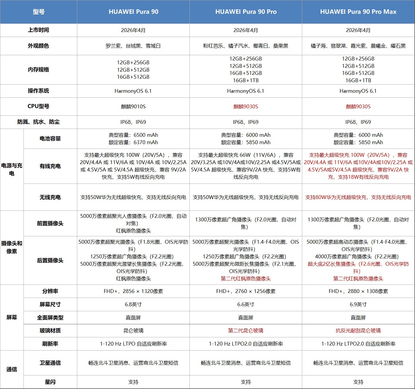| 型号 | Pura 90 | Pura 90 Pro | Pura 90 Pro Max | |